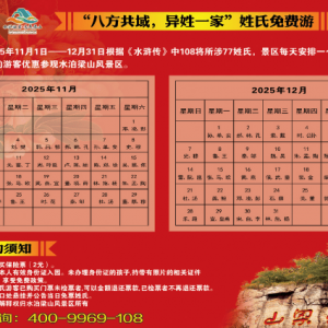 为进一步提升“水浒故里,忠义梁山”旅游品牌影响力,水泊梁山风景区于2025年11月1日至12月31日,推出“八方共域,异姓一家”...