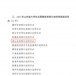 梁山县项目办荣获2025年山东省大学生志愿服务西部计划优秀县...