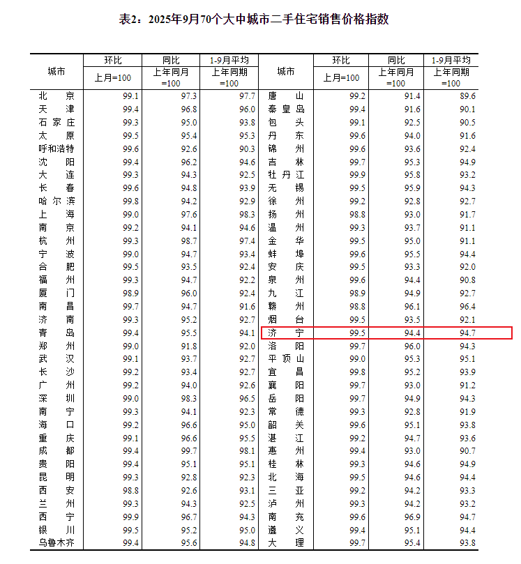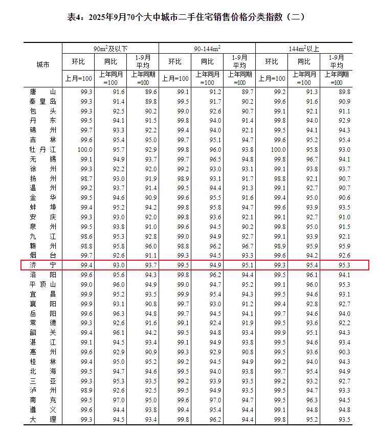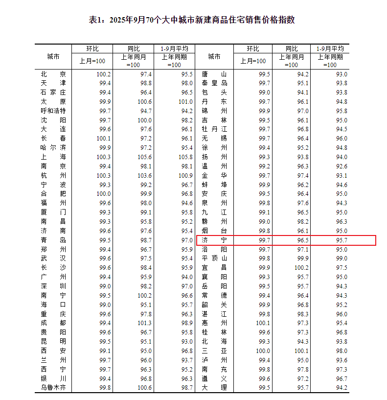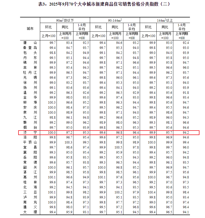 小编注意到:今早9点30分,国家统计局发布了2025年9月份70个大中城市商品住宅销售价格变动情况统计数据。2025年9月份济宁新建商品住宅销售价格环比下降0.3个百分点。