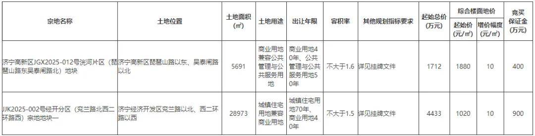 从2宗地块的具体分布上看,济宁高新区1宗、济宁经开区1宗。从土地用途来看,1宗商业用地兼容公共管理与公共服务用地、1宗城镇住宅用地兼容商业用地。土地总面积为34664㎡,约52亩;起始价为6145万元。