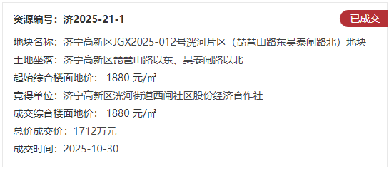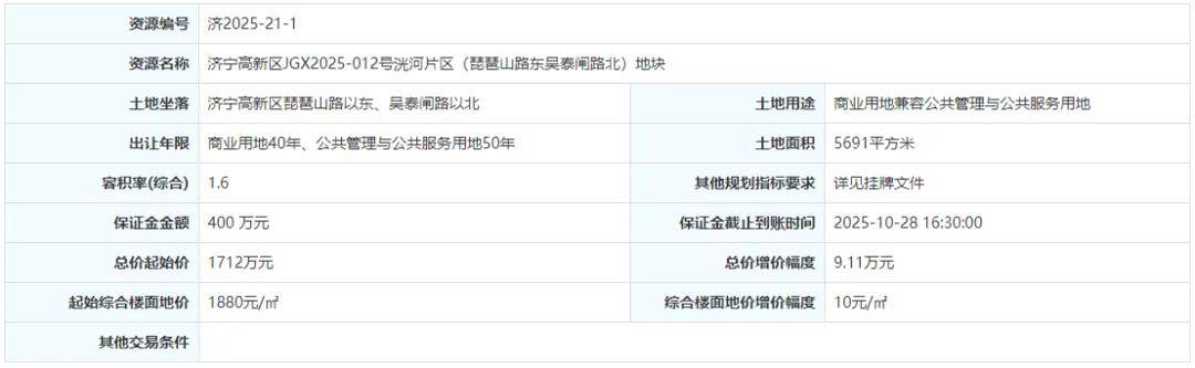 土地位于:济宁高新区琵琶山路以东、吴泰闸路以北;土地面积:5691㎡(约8.5亩);土地用途:商业用地兼容公共管理与公共服务用地;出让年限:商业用地40年、公共管理与公共服务用地50年;容积率不大于1.6;起始价:1712万元,综合楼面价起价:1880元/㎡;最终成交价为:1712万元(约201万元/亩),综合楼面地价成交价:1880元/㎡;溢价率:0.0%;