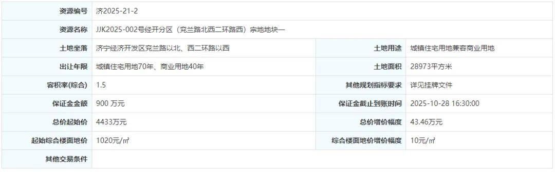 土地位于:济宁经济开发区兖兰路以北、西二环路以西;土地面积:28973㎡(约43.5亩);土地用途:城镇住宅用地兼容商业用地;出让年限:城镇住宅用地70年、商业用地40年;容积率不大于1.5;起始价:4433万元,综合楼面价起价:1020元/㎡;最终成交价为:4433万元(约102万元/亩),综合楼面地价成交价:1020元/㎡;溢价率:0.0%;