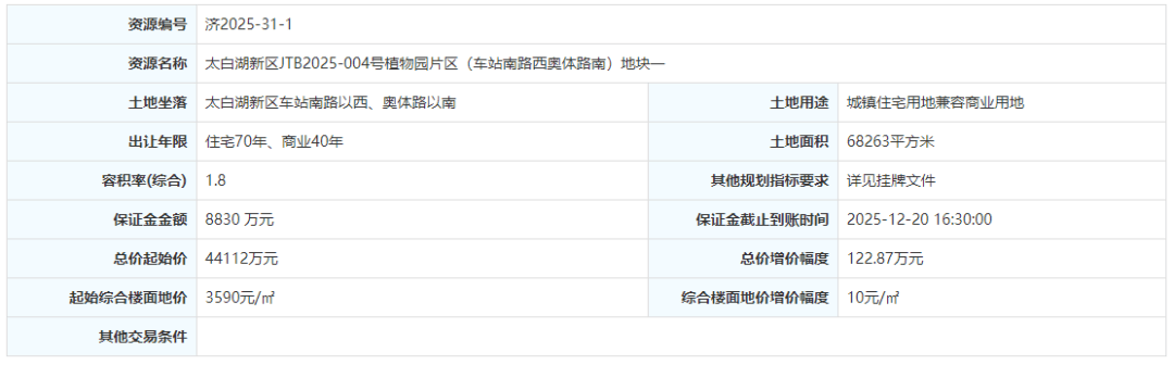 土地位于:太白湖新区车站南路以西、奥体路以南;土地面积:68263㎡(约102.4亩);土地用途:城镇住宅用地兼容商业用地;出让年限:住宅70年、商业40年;容积率不大于1.8;起始价:44112万元,综合楼面价起价:3590元/㎡;