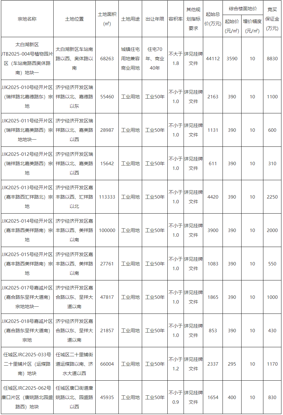 JJK2025-010号经开片区(瑞祥路北嘉德路东)宗地、JJK2025-011号经开片区(瑞祥路北嘉美路西)宗地地块一、JJK2025-012号经开片区(瑞祥路北嘉美路西)宗地、JJK2025-013号经开片区(嘉丰路西汇祥路北)宗地、JJK2025-014号经开片区(嘉丰路西美祥路南)宗地、JJK2025-015号经开片区(嘉丰路西美祥路南)宗地、JJK2025-017号嘉诚片区(嘉合路东呈祥大道南)宗地地块一、JJK2025-018号嘉诚片区(嘉合路东呈祥大道南)宗地、任城区JRC2025-033号二十里铺片区(运煤路南)地块、任城区JRC2025-062号唐口片区(唐姚路北园盛路西)地块建设项目用地出让执行工业项目用地标准化供应方案。