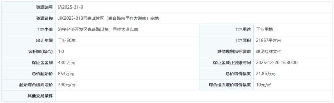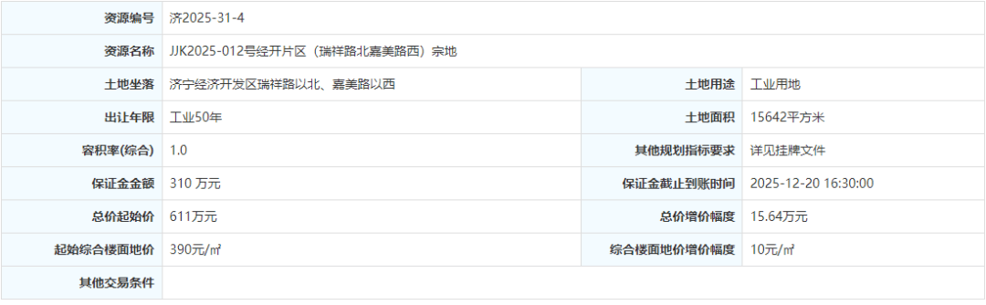 土地位于:济宁经济开发区瑞祥路以北、嘉美路以西;土地面积:15642㎡(约23.5亩);土地用途:工业用地;出让年限:50年;容积率不小于1.0;起始价:611万元,综合楼面价起价:390元/㎡;