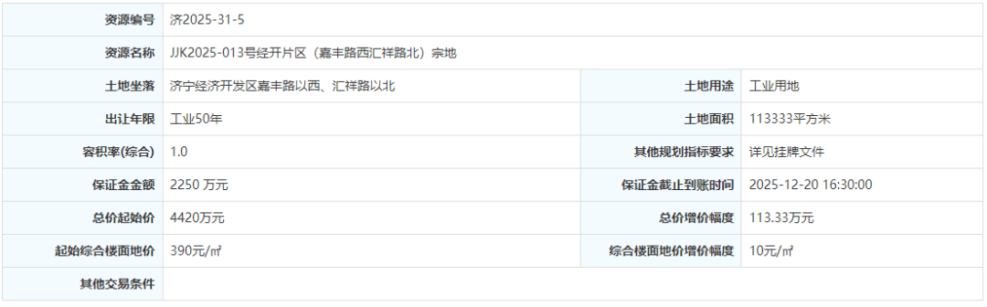 土地位于:济宁经济开发区嘉丰路以西、汇祥路以北;土地面积:113333㎡(约170亩);土地用途:工业用地;出让年限:50年;容积率不小于1.0;起始价:4420万元,综合楼面价起价:390元/㎡;