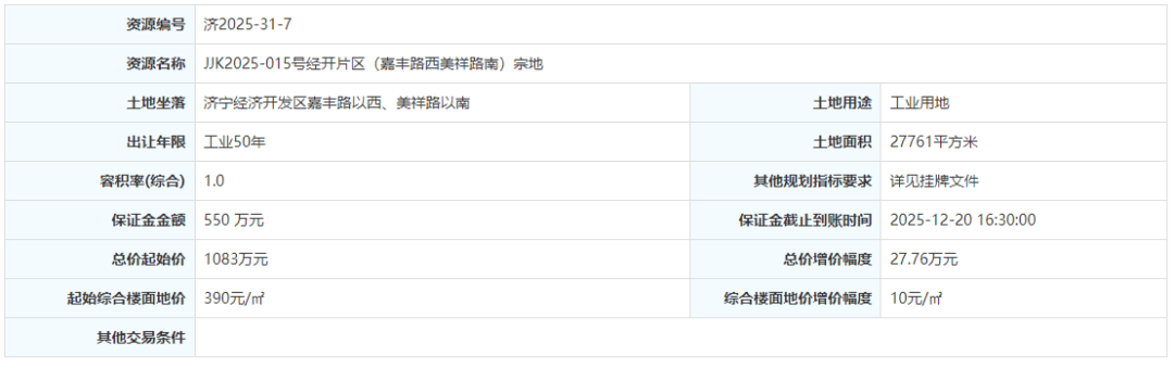 土地位于:济宁经济开发区嘉丰路以西、美祥路以南;土地面积:27761㎡(约42亩);土地用途:工业用地;出让年限:50年;容积率不小于1.0;起始价:1083万元,综合楼面价起价:390元/㎡;