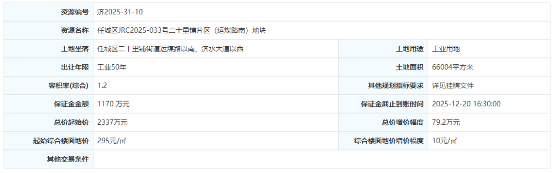 土地位于:任城区二十里铺街道运煤路以南、济水大道以西;土地面积:66004㎡(约99亩);土地用途:工业用地;出让年限:50年;容积率不小于1.2;起始价:2337万元,综合楼面价起价:295元/㎡;
