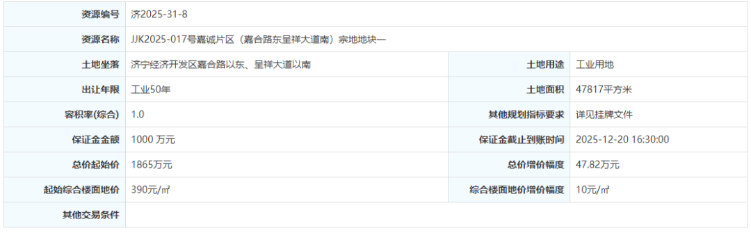 土地位于:济宁经济开发区嘉合路以东、呈祥大道以南;土地面积:47817㎡(约72亩);土地用途:工业用地;出让年限:50年;容积率不小于1.0;起始价:1865万元,综合楼面价起价:390元/㎡;