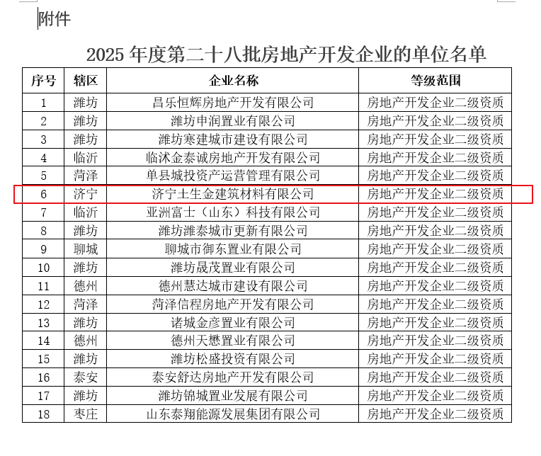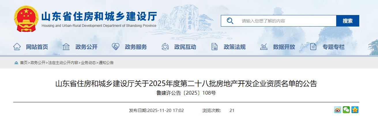 近日,小编了解到:根据《关于修改<房地产开发企业资质管理规定>的决定》(住房和城乡建设部令第54号)及有关实施要求,山东省住房和城乡建设厅对2025年度第二十七批房地产开发企业资质的申请材料进行了公示,现将核准的名单予以公告。