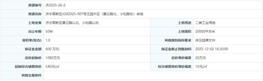1. 任城区JRC2025-035号二十里铺片区(科技路北兴科路西)地块:2025年12月27日9时00分至2026年1月7日9时00分;