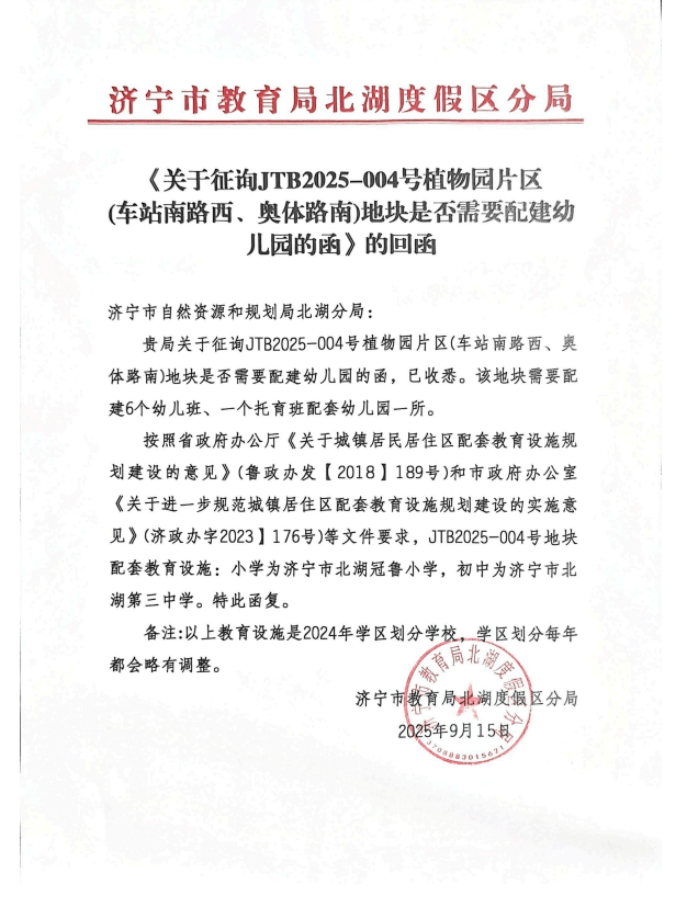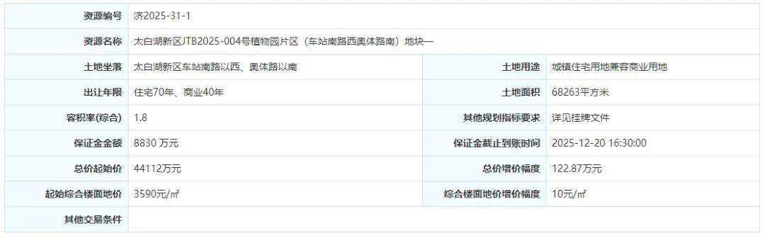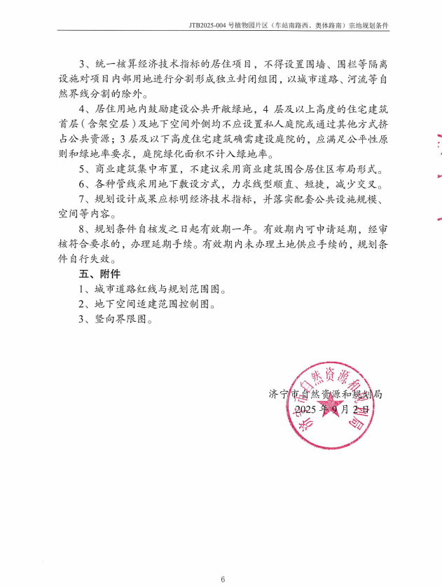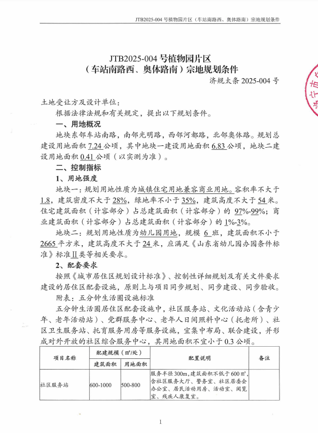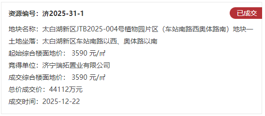 地块一:太白湖新区JTB2025-004号植物园片区(车站南路西奥体路南)地块一【济宁瑞拓置业有限公司竞得】