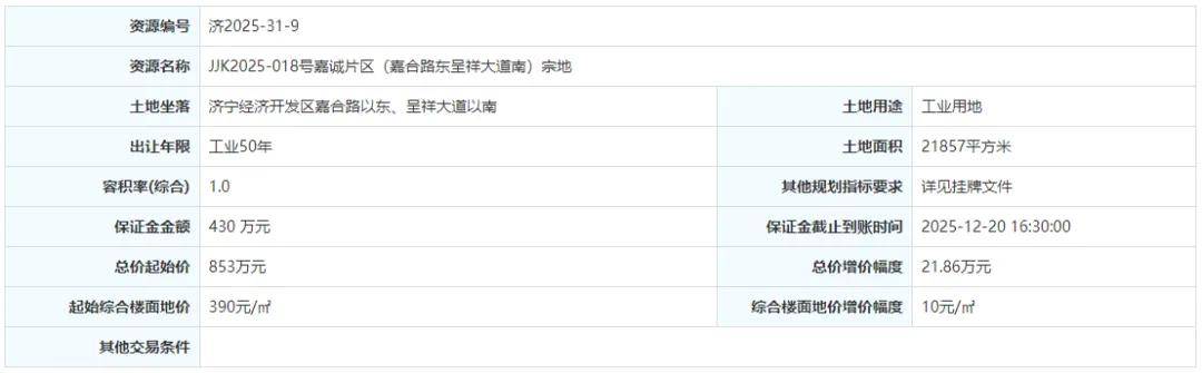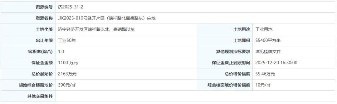 土地位于:济宁经济开发区瑞祥路以北、嘉美路以西;土地面积:28987㎡(约44亩);土地用途:工业用地;出让年限:50年;容积率不小于1.0;起始价:1131万元,综合楼面价起价:390元/㎡;最终成交价为:1131万元(约26万元/亩),综合楼面地价成交价:390元/㎡;溢价率:0.0%;