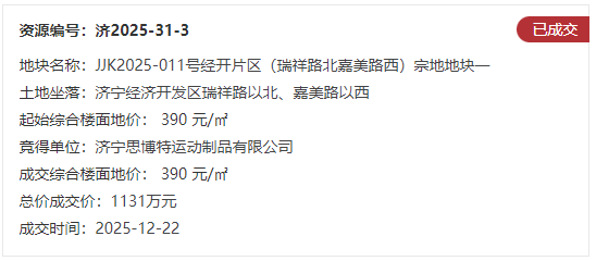 地块三:JJK2025-011号经开片区(瑞祥路北嘉美路西)宗地地块一【济宁思博特运动制品有限公司竞得】