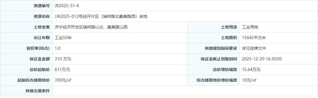 土地位于:济宁经济开发区瑞祥路以北、嘉美路以西;土地面积:15642㎡(约23.5亩);土地用途:工业用地;出让年限:50年;容积率不小于1.0;起始价:611万元,综合楼面价起价:390元/㎡;最终成交价为:611万元(约26万元/亩),综合楼面地价成交价:390元/㎡;溢价率:0.0%;