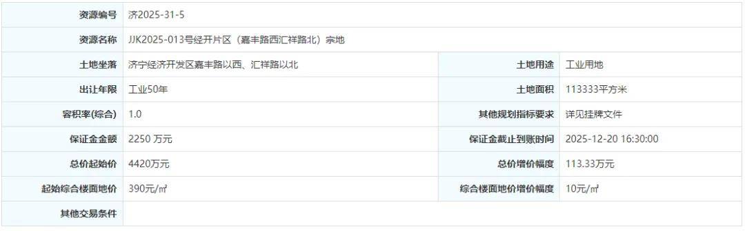 土地位于:济宁经济开发区嘉丰路以西、汇祥路以北;土地面积:113333㎡(约170亩);土地用途:工业用地;出让年限:50年;容积率不小于1.0;起始价:4420万元,综合楼面价起价:390元/㎡;最终成交价为:4420万元(约26万元/亩),综合楼面地价成交价:390元/㎡;溢价率:0.0%;