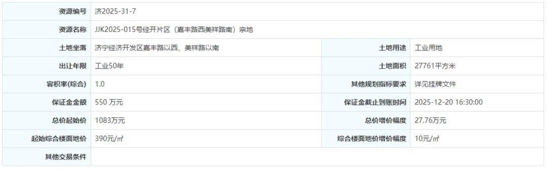 土地位于:济宁经济开发区嘉丰路以西、美祥路以南;土地面积:27761㎡(约42亩);土地用途:工业用地;出让年限:50年;容积率不小于1.0;起始价:1083万元,综合楼面价起价:390元/㎡;最终成交价为:1083万元(约26万元/亩),综合楼面地价成交价:390元/㎡;溢价率:0.0%;