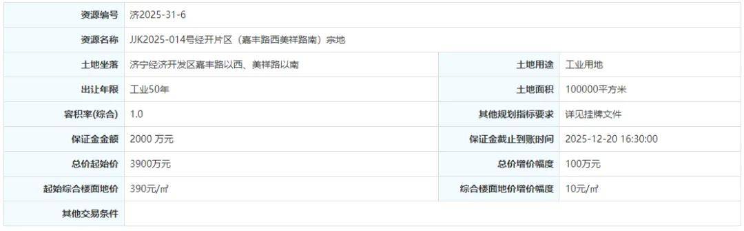 土地位于:济宁经济开发区嘉丰路以西、美祥路以南;土地面积:100000㎡(约150亩);土地用途:工业用地;出让年限:50年;容积率不小于1.0;起始价:3900万元,综合楼面价起价:390元/㎡;最终成交价为:3900万元(约26万元/亩),综合楼面地价成交价:390元/㎡;溢价率:0.0%;