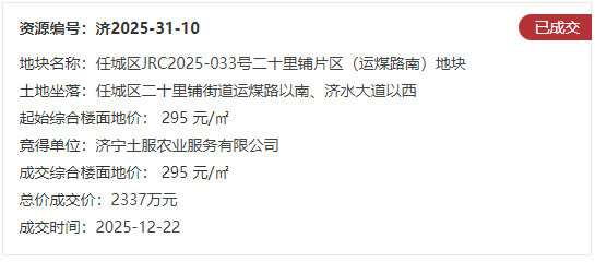 土地位于:任城区二十里铺街道运煤路以南、济水大道以西;土地面积:66004㎡(约99亩);土地用途:工业用地;出让年限:50年;容积率不小于1.2;起始价:2337万元,综合楼面价起价:295元/㎡;最终成交价为:2337万元(约24万元/亩),综合楼面地价成交价:295元/㎡;溢价率:0.0%;