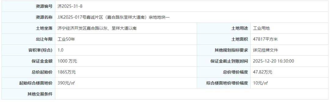 土地位于:济宁经济开发区嘉合路以东、呈祥大道以南;土地面积:47817㎡(约72亩);土地用途:工业用地;出让年限:50年;容积率不小于1.0;起始价:1865万元,综合楼面价起价:390元/㎡;最终成交价为:1865万元(约26万元/亩),综合楼面地价成交价:390元/㎡;溢价率:0.0%;
