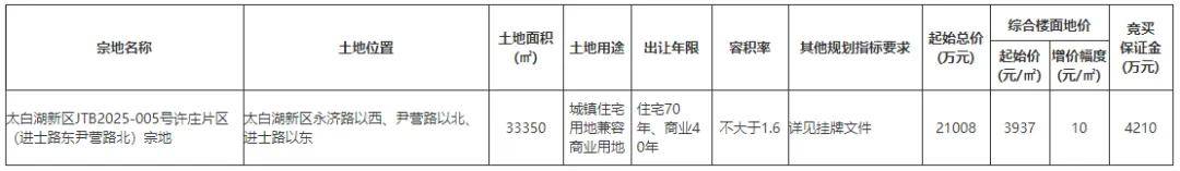 土地位于:太白湖新区永济路以西、尹营路以北、进士路以东;土地面积:33350㎡(约50亩);土地用途:城镇住宅用地兼容商业用地;出让年限:住宅70年、商业40年;容积率:不大于1.6;起始价:21008万元,综合楼面价起价:3937元/㎡;最终成交价为:23996万元(约480万元/亩),综合楼面地价成交价:4497元/㎡;溢价率:14.2%;