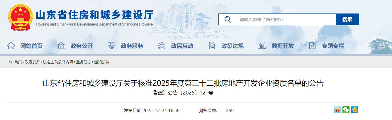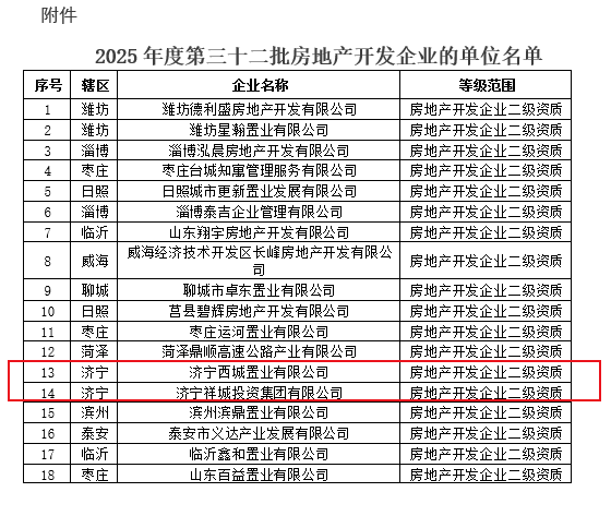 近日,小编了解到:根据《关于修改<房地产开发企业资质管理规定>的决定》(住房和城乡建设部令第54号)及有关实施要求,山东省住房和城乡建设厅对2025年度第三十一批房地产开发企业资质的申请材料进行了公示,现将核准的名单予以公告。