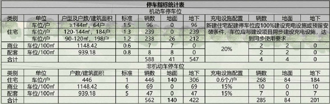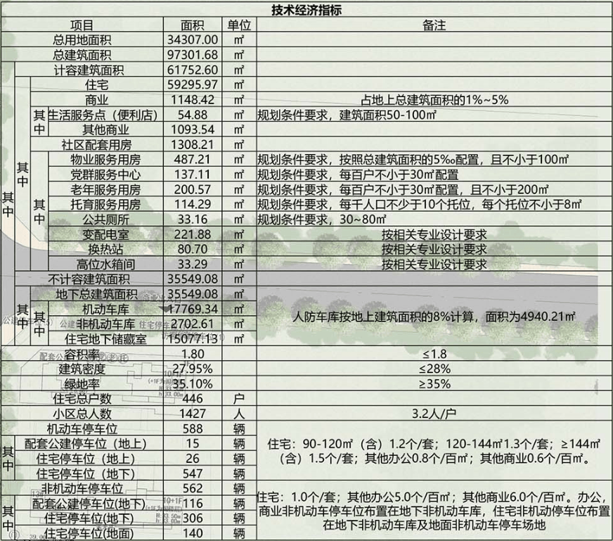 项目规划建设用地面积34307㎡;总建筑面积:97301.68㎡;其中,计容建筑面积:61752.60㎡(含住宅建筑面积59295.97㎡、商业建筑面积1148.42㎡、社区配套用房建筑面积1308.2㎡),地下建筑面积35549.08㎡。容积率1.8;建筑密度27.95%;绿地率35.10%;计划总居住户(套)数为446户(套),居住人数约1427人(按3.2人/户预算);建筑类型包括住宅、商业、社区配套用房、公服配套设施等;规划机动车停车位588个,非机动车停车位562个。