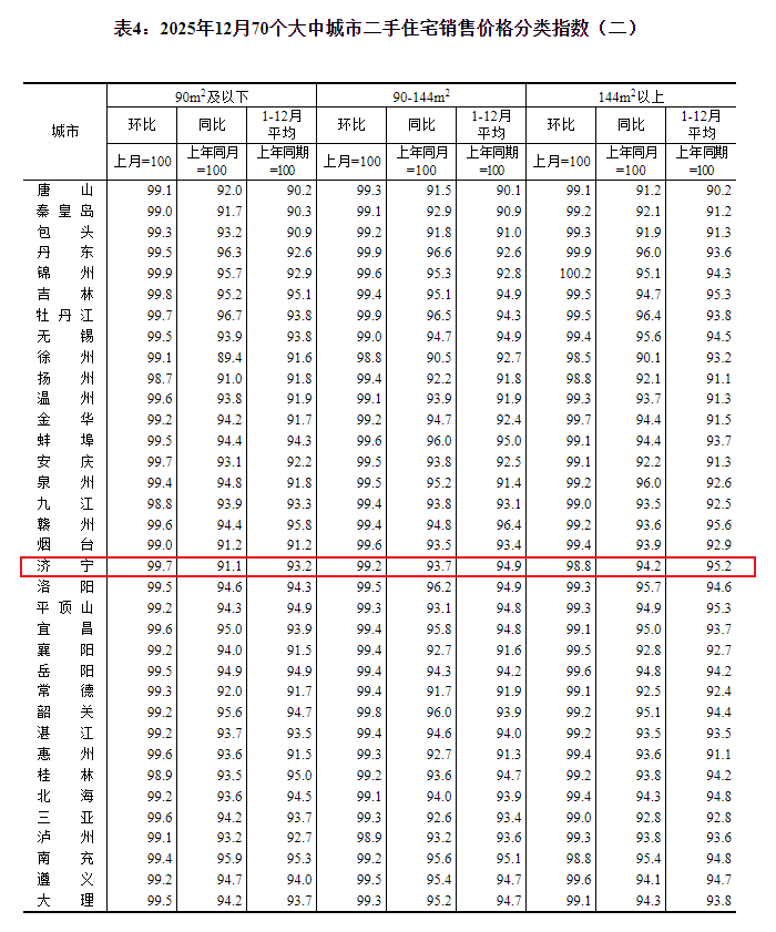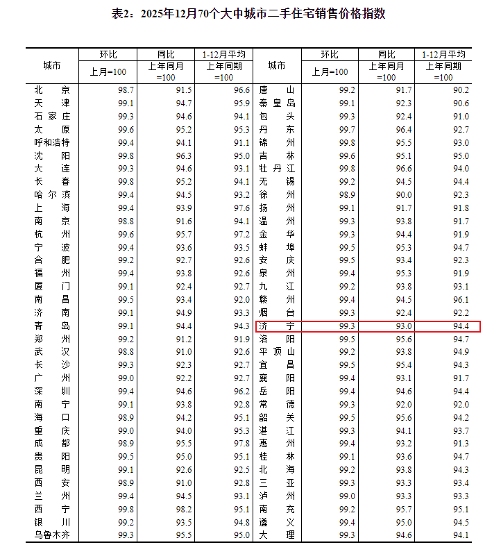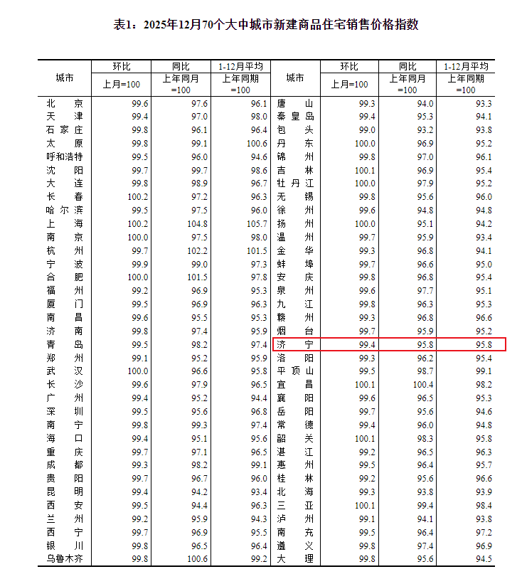 小编注意到:今早9点30分,国家统计局发布了2025年12月份70个大中城市商品住宅销售价格变动情况统计数据。2025年12月份济宁新建商品住宅销售价格环比下降0.6个百分点。
