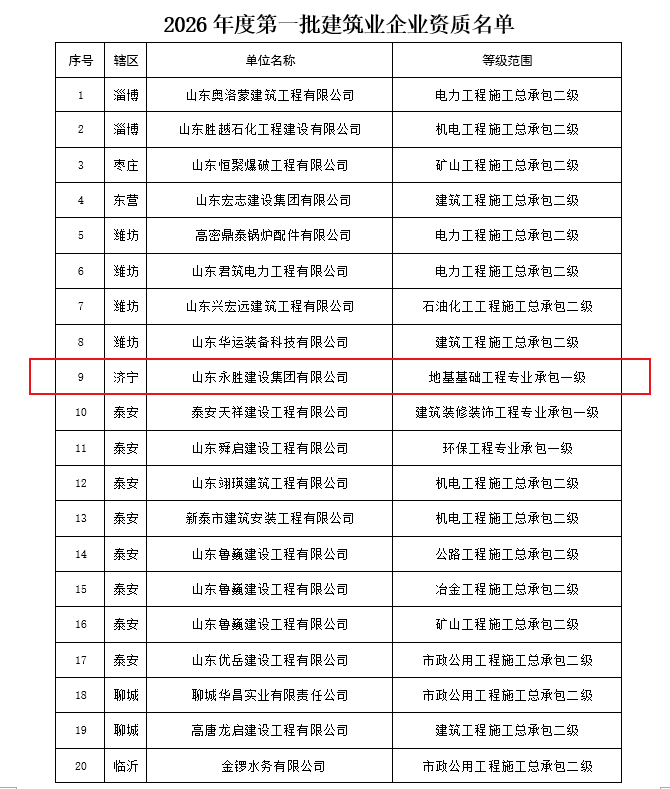 小编了解到:近日,山东省住房和城乡建设厅发布关于2026年度第一批建筑业企业资质名单的公告,根据《建筑业企业资质管理规定》(住房城乡建设部第22号令) 及有关实施要求,山东省住房和城乡建设厅对2026年度第一批建筑业企业资质的申请材料进行了公示,现将核准的名单予以公告。