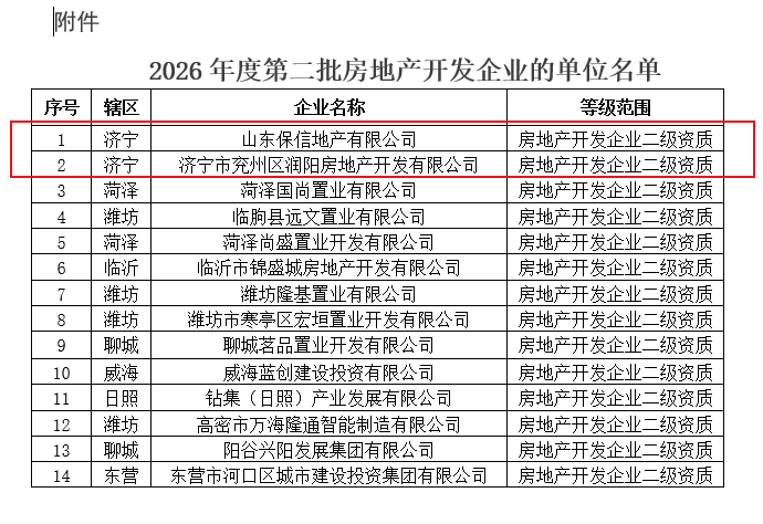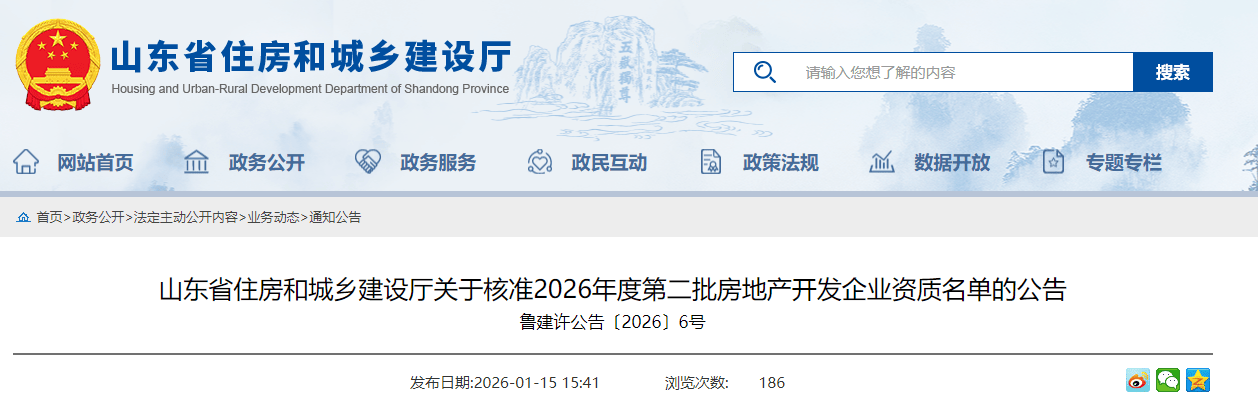 近日,小编了解到:根据《关于修改<房地产开发企业资质管理规定>的决定》(住房和城乡建设部令第54号)及有关实施要求,山东省住房和城乡建设厅对2026年度第一批房地产开发企业资质的审查意见进行了公示,现将核准的名单予以公告。