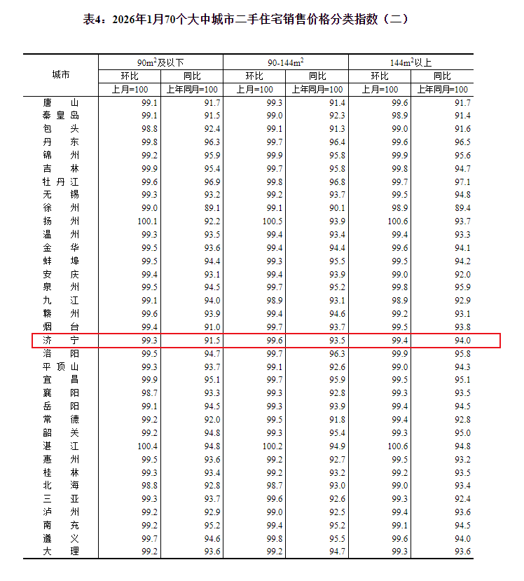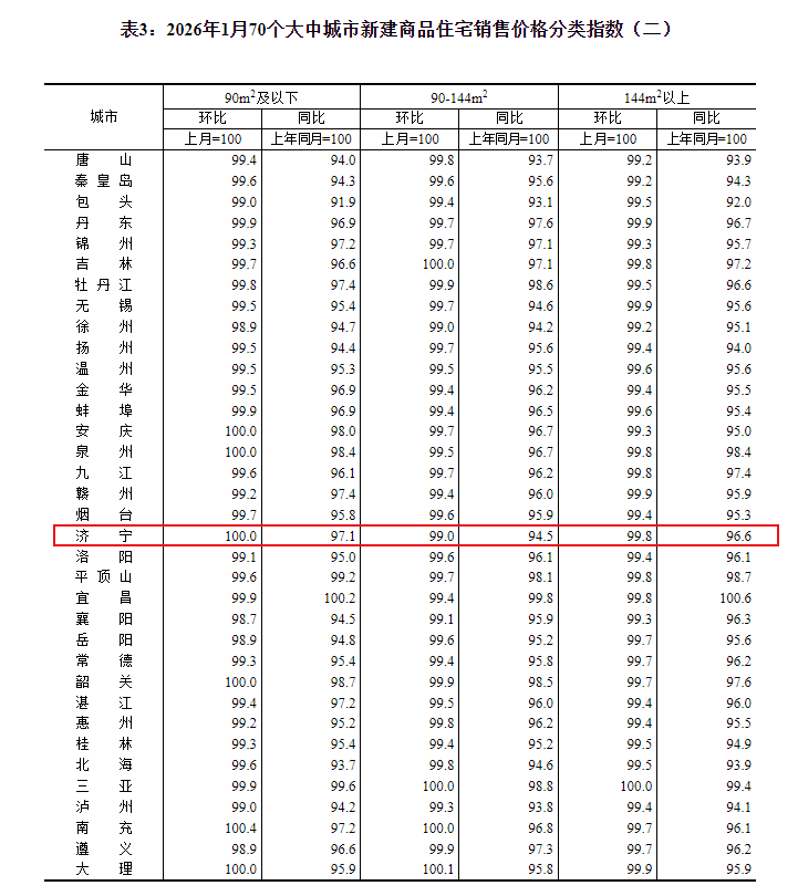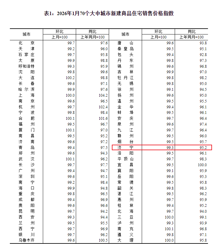 小编注意到:今早9点30分,国家统计局发布了2026年1月份70个大中城市商品住宅销售价格变动情况统计数据。2026年1月份济宁新建商品住宅销售价格环比下降0.7个百分点。