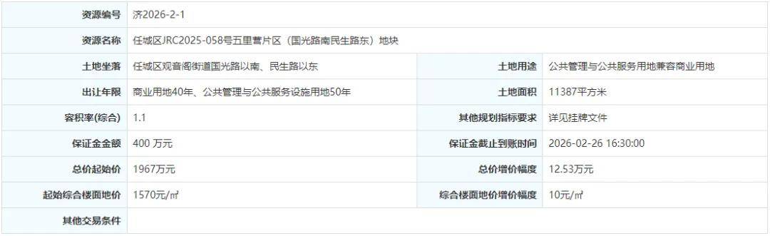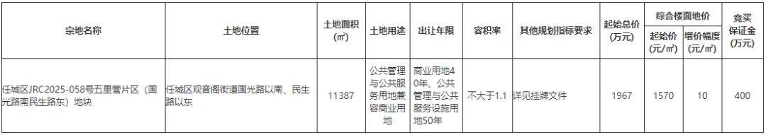 土地位于:任城区观音阁街道国光路以南、民生路以东;土地面积:11387㎡(约17亩);土地用途:公共管理与公共服务用地兼容商业用地;出让年限:商业用地40年、公共管理与公共服务设施用地50年;容积率:不大于1.1;起始价:1967万元,综合楼面价起价:1570元/㎡;最终成交价为:1967万元(约116万元/亩),综合楼面地价成交价:1570元/㎡;溢价率:0.0%;