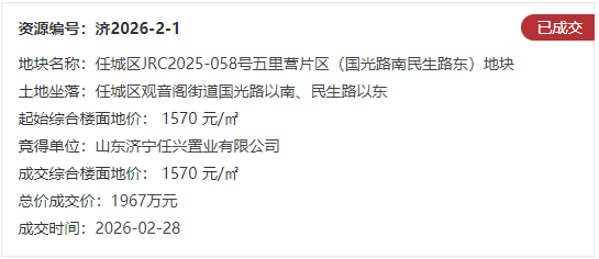 最终,山东济宁任兴置业有限公司成功摘得1宗地块。