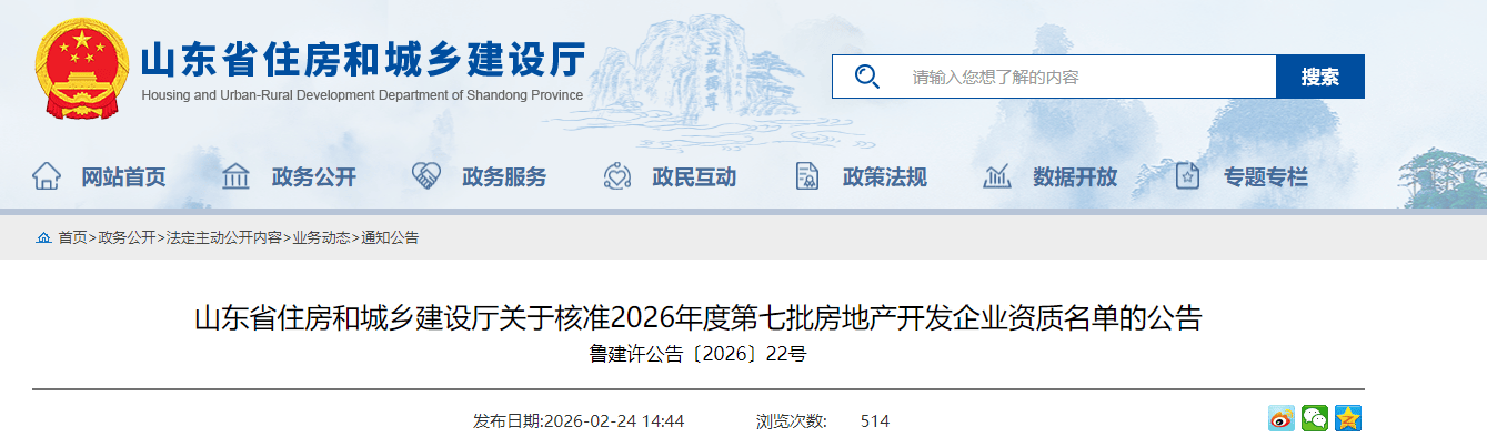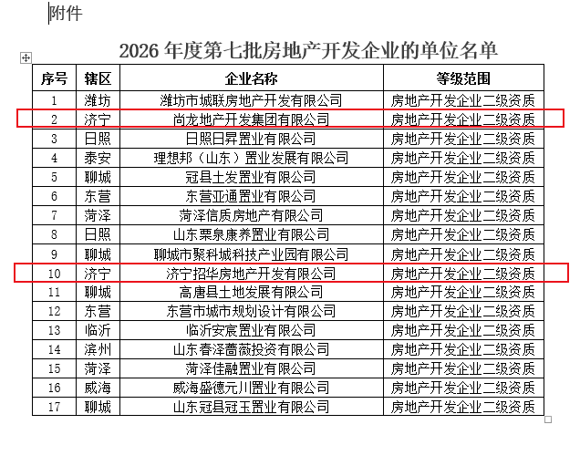 近日,小编了解到:根据《关于修改<房地产开发企业资质管理规定>的决定》(住房和城乡建设部令第54号)及有关实施要求,山东省住房和城乡建设厅对2026年度第六批房地产开发企业资质的审查意见进行了公示,现将核准的名单予以公告。