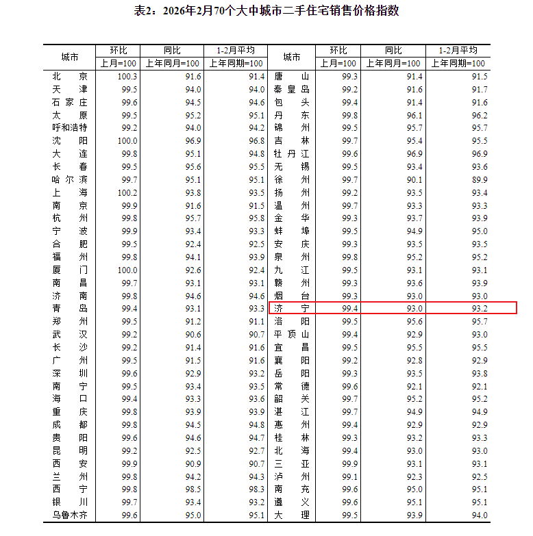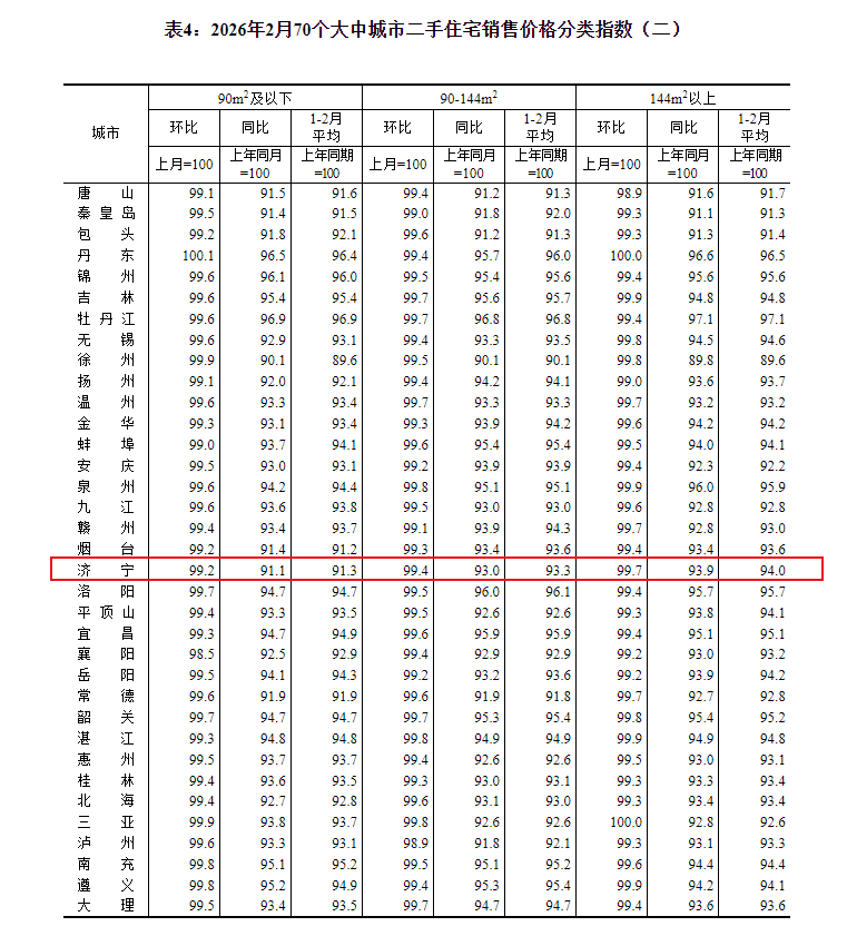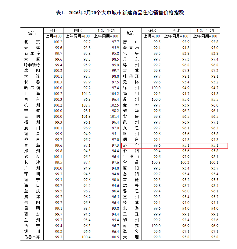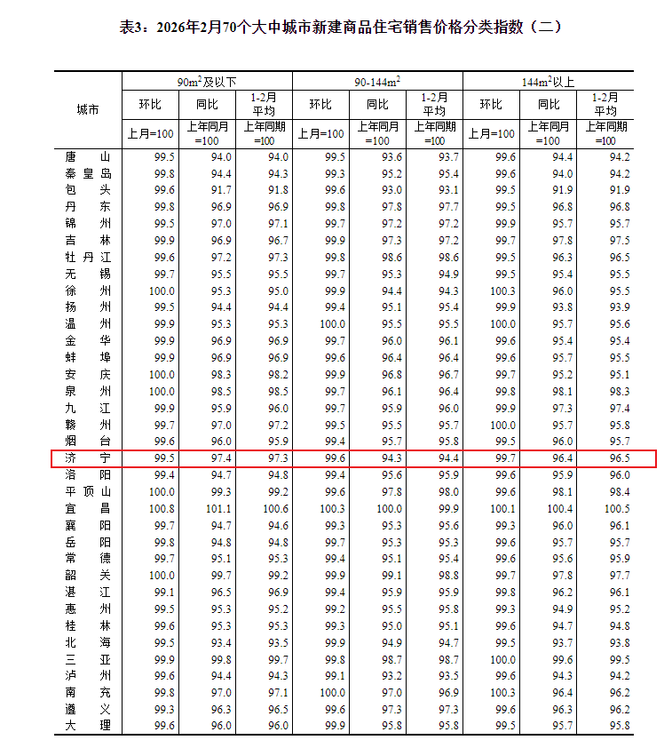 小编注意到:今早9点30分,国家统计局发布了2026年2月份70个大中城市商品住宅销售价格变动情况统计数据。2026年2月份济宁新建商品住宅销售价格环比下降0.4个百分点。