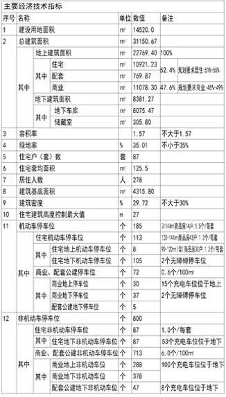 项目规划建设用地面积14520㎡(约22亩);总建筑面积:31150.67㎡;其中,地上建筑面积:22769.4㎡,地下建筑面积:8381.27㎡。容积率1.57;建筑密度29.72%;绿地率35.01%;计划总居住户(套)数为87户(套),居住人数约278人(按3.2人/户预算);建筑类型包括住宅、商业、社区配套用房、公服配套设施等;规划机动车停车位185个,非机动车停车位800个。