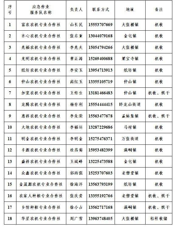 目前,全县正值秋收关键时刻,但连续的阴雨天气给秋粮收割与晾晒储存带来较大困难。为切实做好粮食收获与储存服务,确保秋粮颗粒归仓,现将嘉祥县各镇街的粮食烘干服务点与农机应急作业队联络信息予以公布。请有需要的农民朋友们提前联系,抢抓天气适宜的有利时机尽快收割,并就近选择烘干服务,防止粮食霉变,切实保障粮食品质与收成效益。