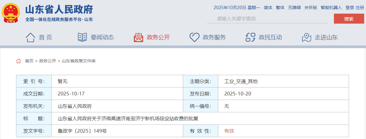 山东省人民政府网站发布《山东省人民政府关于济微高速济南至济宁新机场段设站收费的批复》。全文如下: