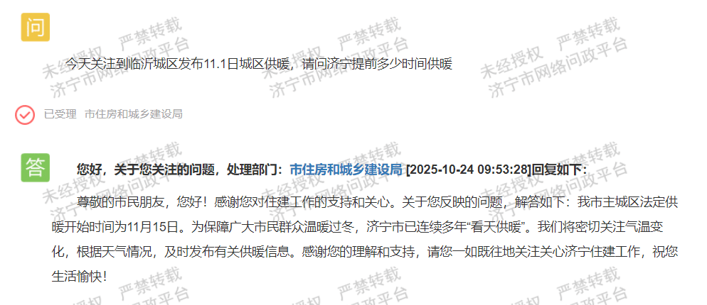 近日,有网友在济宁市网络问政平台留言咨询,济宁提前多少时间供暖?