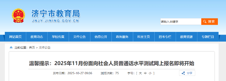 10月27日,济宁市语言文字工作委员会办公室发布公告,根据《济宁市2025年面向社会人员普通话水平测试工作方案》安排,济宁市2025年11月份面向社会人员的普通话水平测试网上报名即将开始。