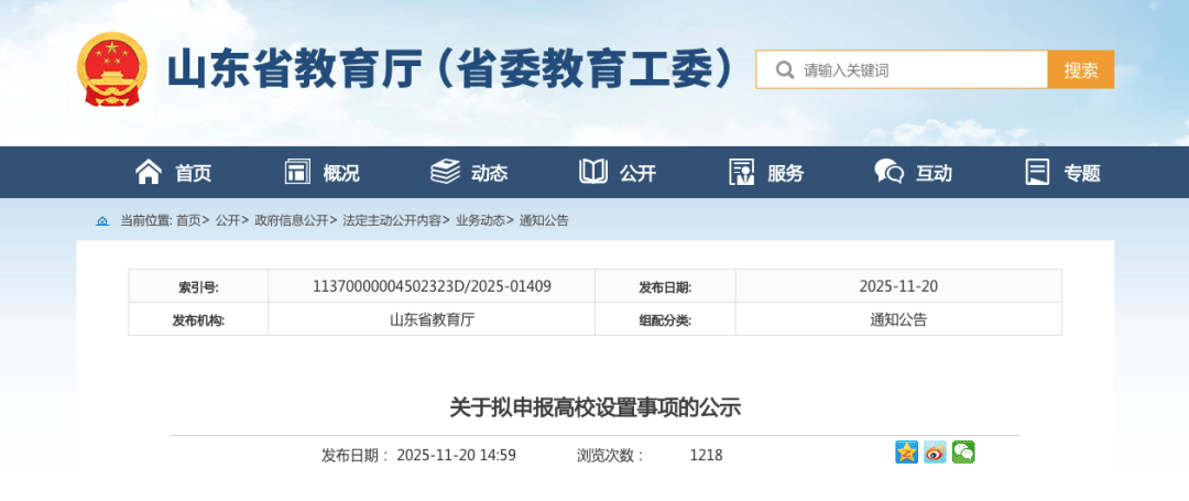 11月20日,山东省教育厅发布《关于拟申报高校设置事项的公示》。