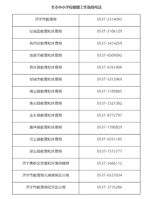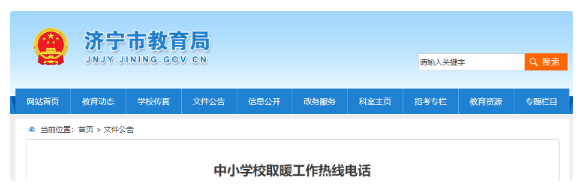 从济宁市教育局获悉,济宁市全面开通中小学校取暖工作热线电话,热线电话负责受理投诉、举报并解答咨询等工作,受理时段为工作日8:30-17:30,一直持续至2025年供暖结束。