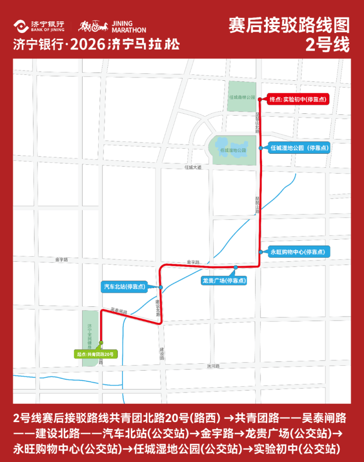 2号线:共青团北路20号(路西)——汽车北站(经停)——龙贵广场(经停)——永旺购物中心(经停)——任城湿地公园(经停)——实验初中(公交站)