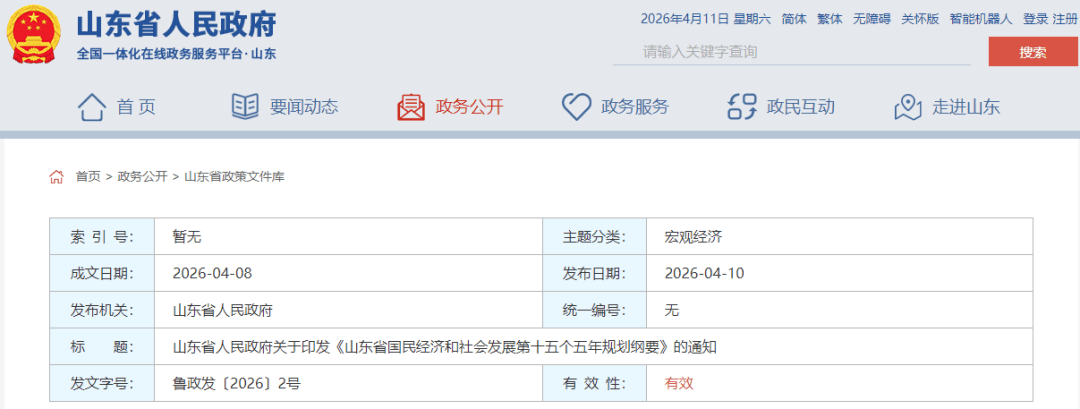 近日,《山东省国民经济和社会发展第十五个五年规划纲要(2026—2030 年)》正式公布。作为全省未来五年发展的总纲领、总遵循,文件对区域协调发展、基础设施建设、现代产业布局、生态保护、文化传承等作出全面系统部署。详情如下: