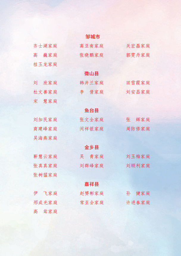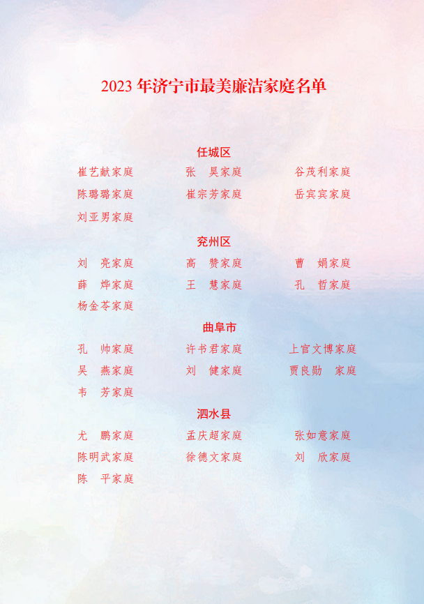 为深入学习宣传贯彻党的二十大精神,落实习近平总书记关于家庭家教家风建设的重要论述精神,涵养廉洁家风,筑牢家庭助廉防线,市纪委监委机关、市妇联在全市开展“树廉洁家风·创最美家庭”活动,根据评选条件,经过综合评议,确定济宁市“最美廉洁家庭”105户。