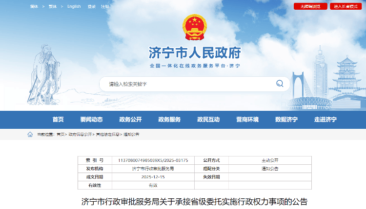 根据《中华人民共和国行政许可法》《中华人民共和国行政处罚法》《山东省行政程序规定》(省政府令第238号)、《山东省人民政府关于部分省级行政权力事项委托实施的决定》(省政府令第368号)等有关法律法规、规章的规定,自2025年12月15日起,济宁市行政审批服务局承接实施超限高层建筑工程抗震设防审批、建筑业企业资质认定、工程监理企业资质认定等28项省级行政权力事项。