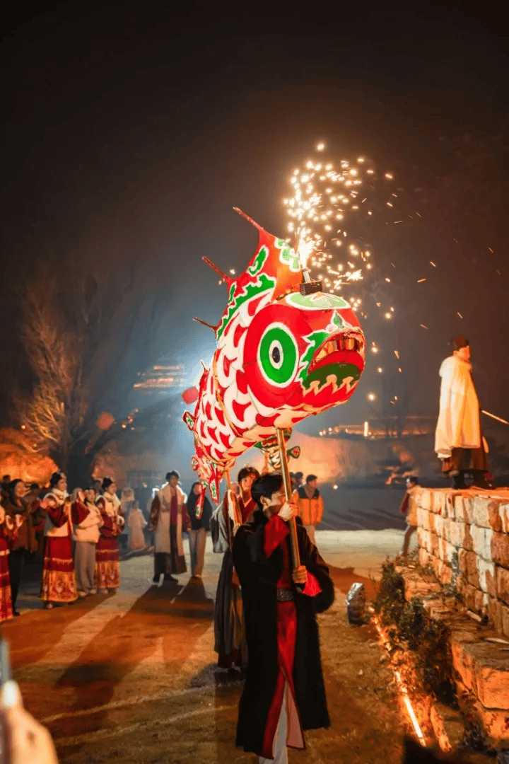 白天观赏异彩纷呈的震撼马战、十里红妆、绝活杂技、传统皮影、经典戏曲、斗鸡耍猴,在一步一景的古村打卡地和家人好友拍不停,邂逅博学多才的“孟子”、歌喉美妙的“绣娘”,和NPC一起玩投壶、套圈、蹴鞠、猜灯谜。夜晚感受独一无二的水幕铁花、马上火壶、火虎快闪、鱼灯巡游、七彩烟花、放飞灯愿。