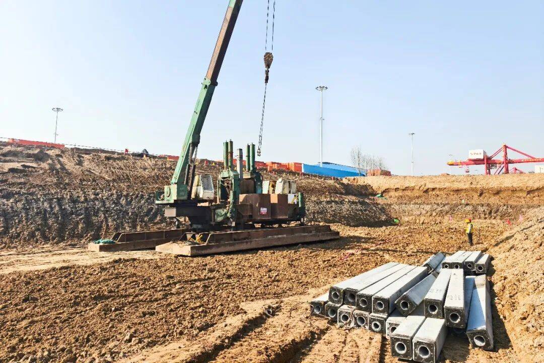 在施工现场,大型静压桩机繁忙作业,采用静压法将高强预应力混凝土空心方桩精准沉入预定位置,这种施工方法具有承载力高、施工噪音小、对周边环境影响小等优势,特别适合港口码头的基础施工。QS-10标段桩型设计长度为6米,施工团队严格遵循“桩位复核—静压沉桩—桩顶标高控制—桩头处理”的工艺流程,每一根桩的入土深度、垂直度及承载力均经过精准检测,确保符合设计与规范要求。