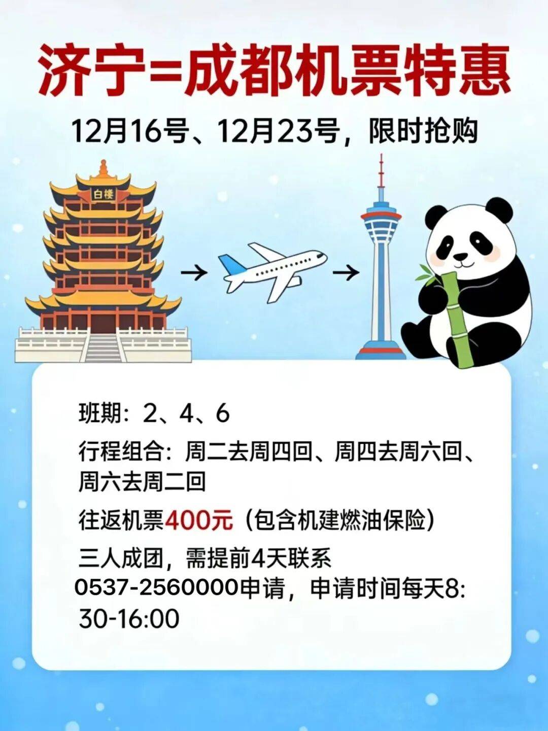 近日,小编了解到:济宁大安机场推出济宁=成都往返400元特惠机票,12月16号、12月23号,限时抢购。班期为每周2、4、6,行程组合:周二去周四回、周四去周六回、周六去周二回。往返机票400元(包含机建燃油保险),三人成团,需提前4天联系0537-2560000申请,申请时间每天:8:30-16:00。