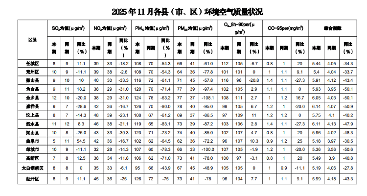 11月份,环境空气质量最佳的县(市、区)为曲阜市,综合指数5.18;最差的县(市、区)为嘉祥县,综合指数6.14。环境空气质量恶化幅度最小的县(市、区)为太白湖新区恶化27.8%;恶化幅度最大的县(市、区)为嘉祥县恶化50.9%。